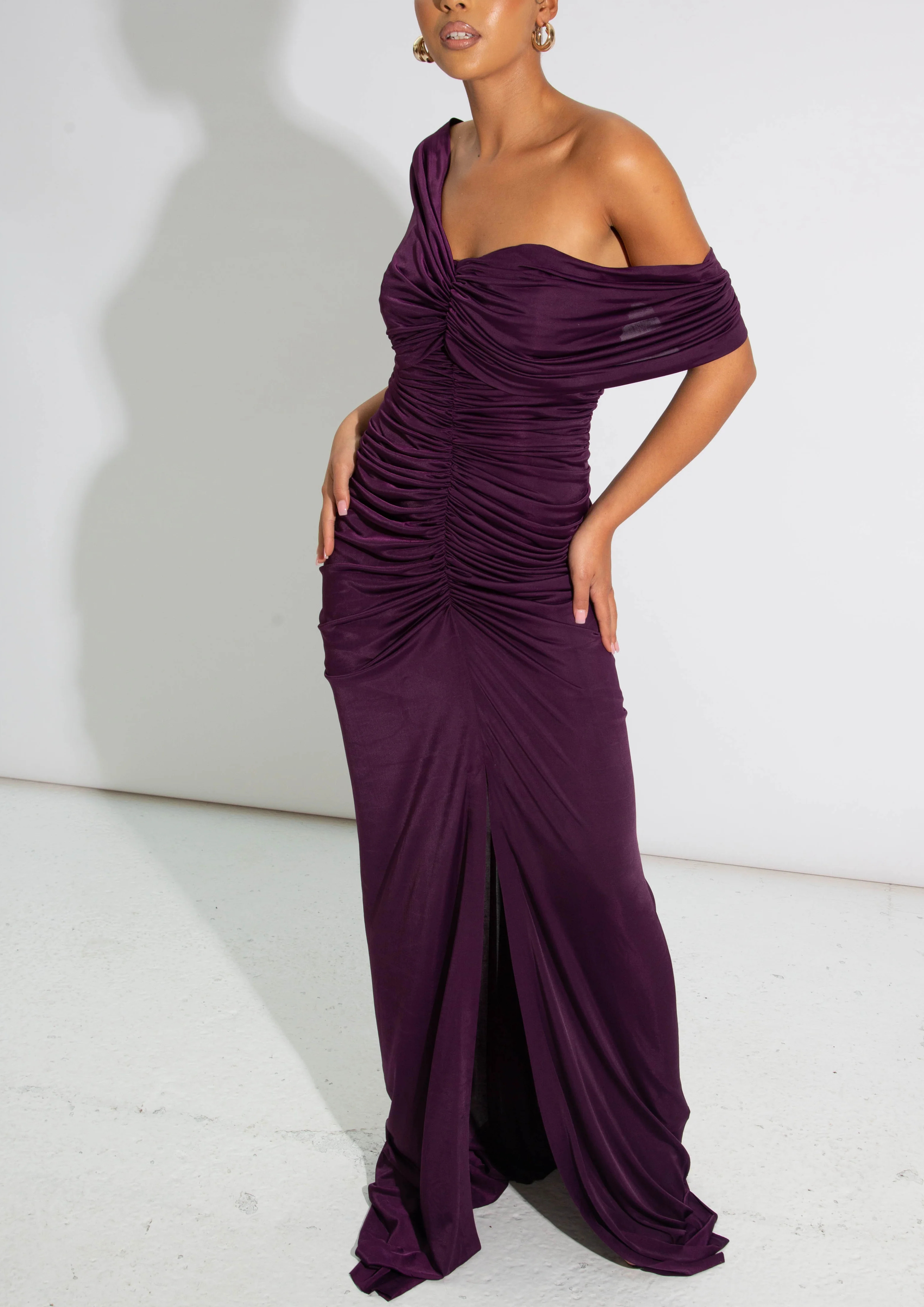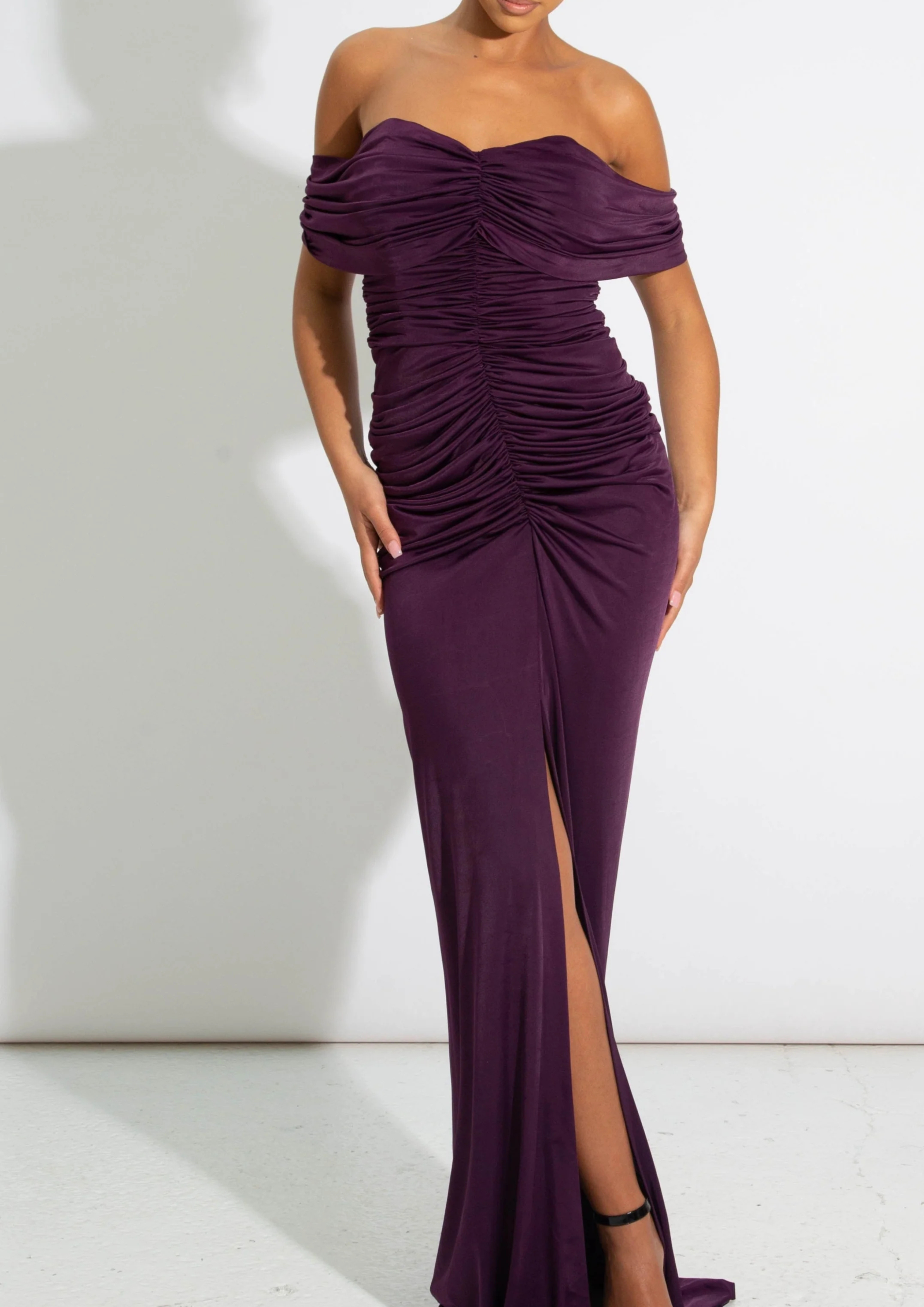 This floor length number is the perfect compliment for your next evening occasion. Her ruched bodice is form flattering, while her versatile sleeves can be perfected to your preference.