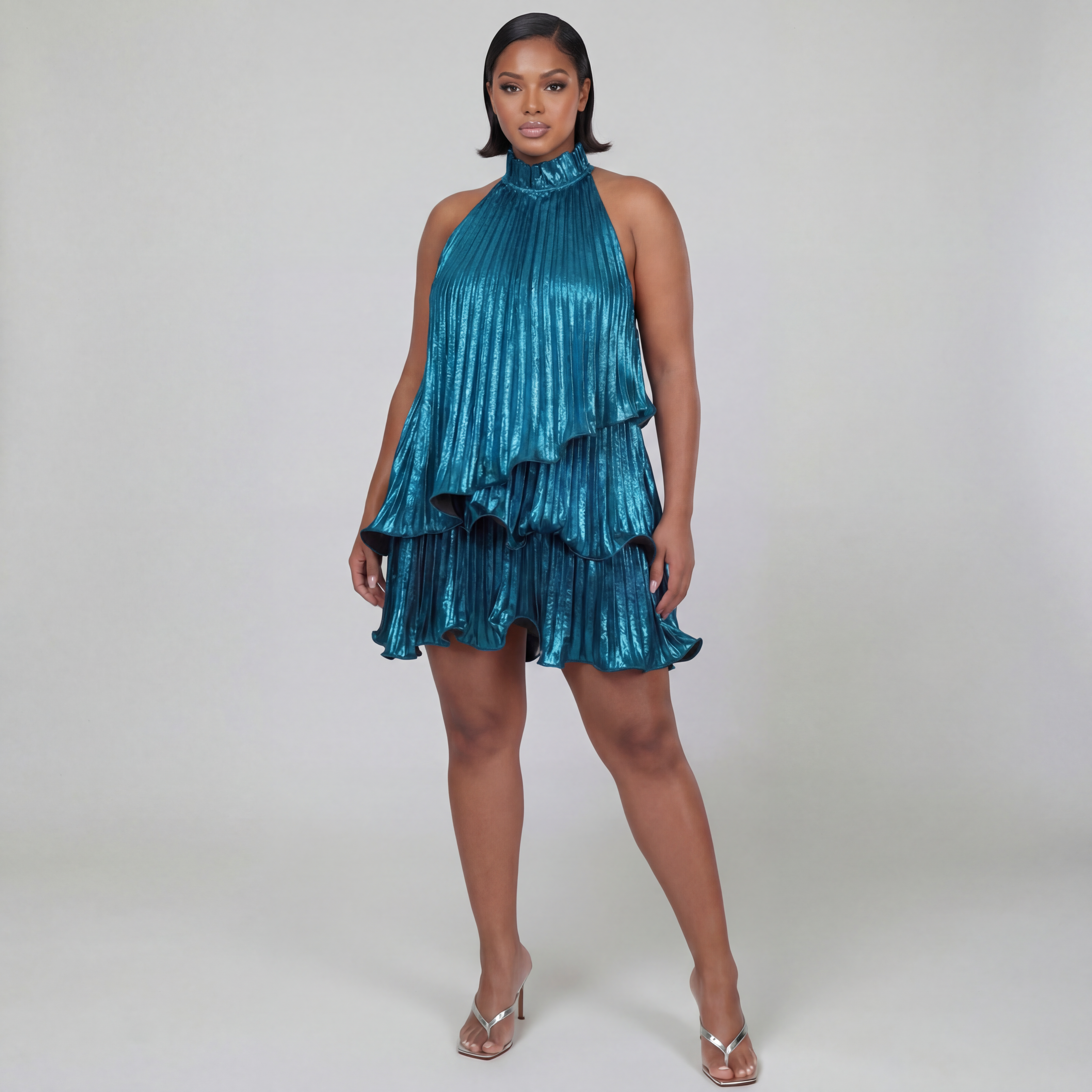 "Can I order a blue cocktail please?"... Introducing, 'Ireti'; the fun, playful, metallic mini dress. Made in a gorgeous shimmering blue, with asymmetric layers, light ruffles, gathered collar band and a softly scooped back.