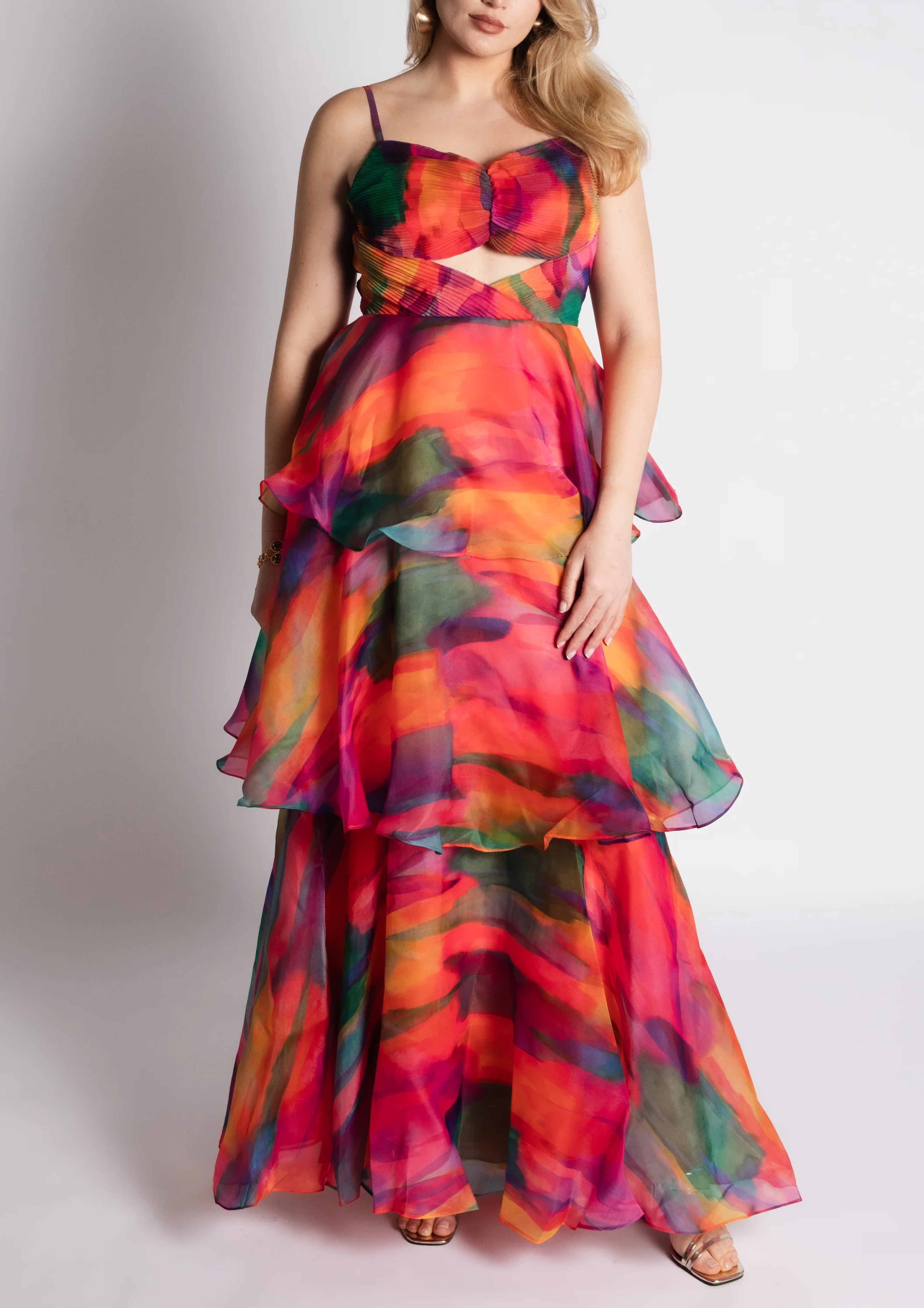 She features a delicately pleated bodice, peek-a-boo cutout and adjustable straps; perfect for any formal event under the sun. The organza tiered skirt is full of movement and fits freely around the hips for guaranteed comfort.