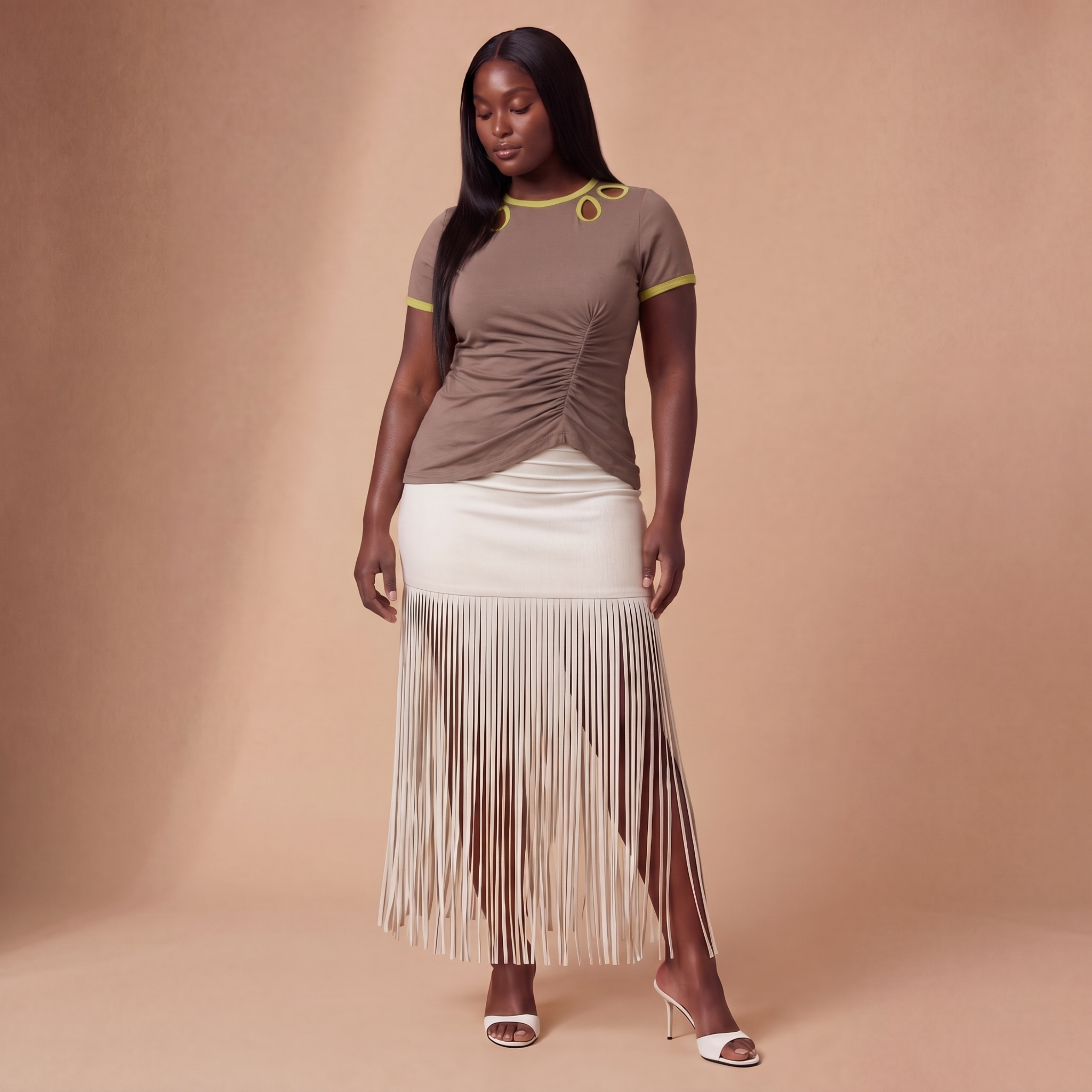 The design is elevated with subtle ruching through the front, creating a flattering, sculpted effect, while the contrast trim at the neckline and sleeves adds a sharp, considered finish. Delicate cut-out detailing along the neckline introduces a modern edge, balancing simplicity with statement.