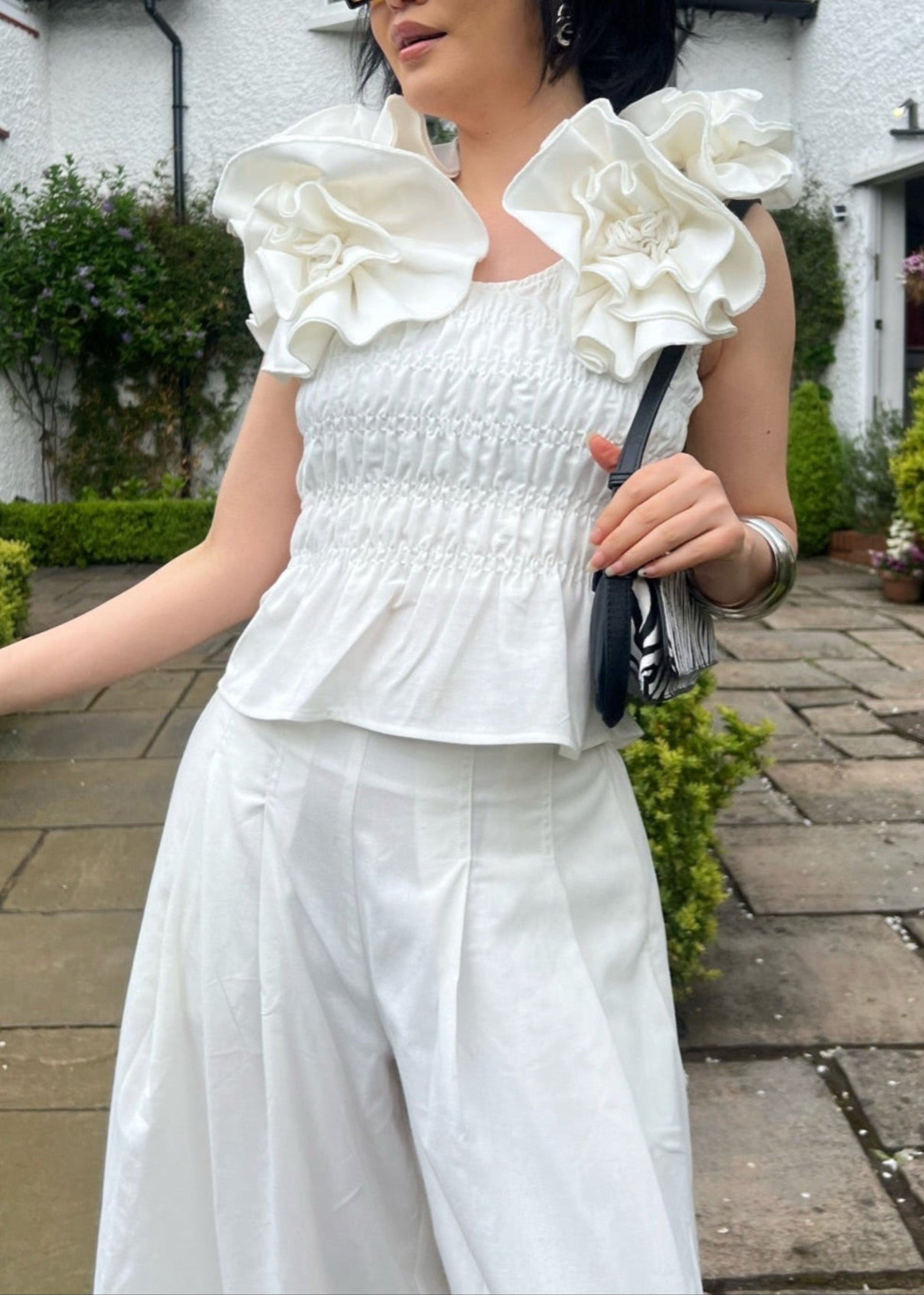 A modern take on statement dressing. This top features soft, sculpted flowers at the shoulders and a smocked bodice for a flattering, flexible fit. Designed to feel bold yet effortless. Pair it with the matching Nifemi trousers, or style it with a skirt or your favorite jeans.